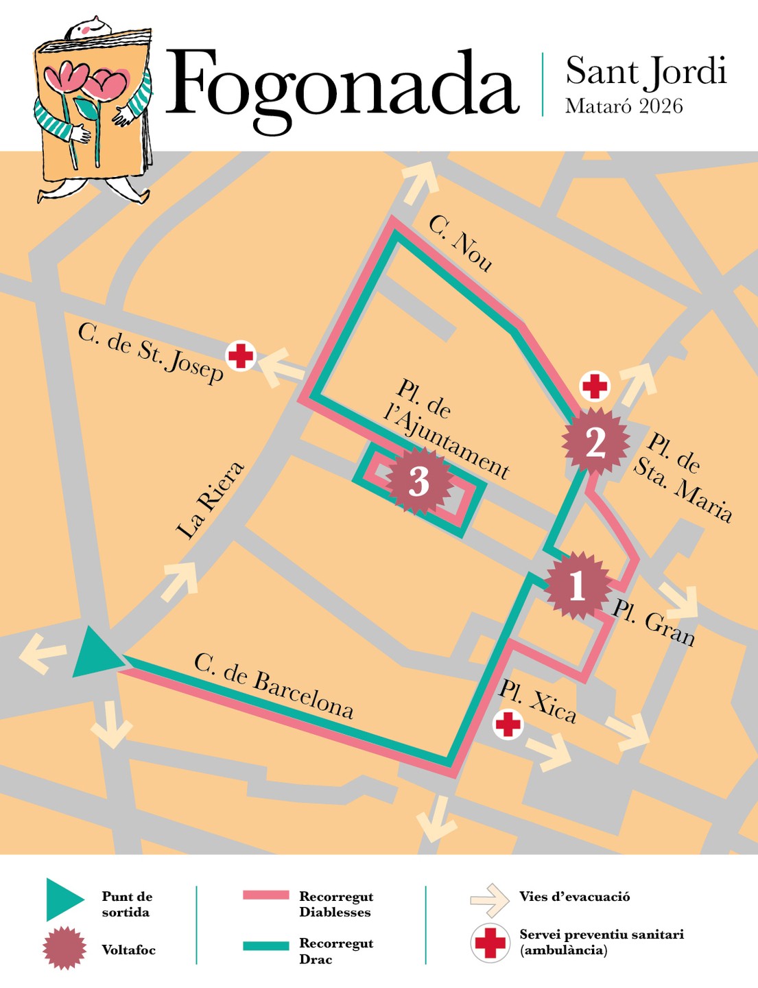 Els carrers de Mataró es tornaran a omplir de màgia i foc per explicar als mataronins l'adaptació de la llegenda de Sant Jordi, amb el Drac de Mataró com a protagonista. Juntament amb les Diablesses farà un recorregut pels carrers del centre històric de la ciutat. A les places, tothom que ho vulgui, podrà ballar al ritme de la música amb els tradicionals voltafocs. En acabar, el grup de música tradicional La Coixinera oferirà un concert.