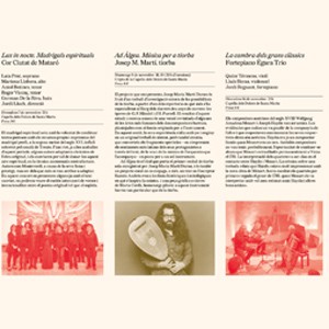 ENTRADES EXHAURIDES Concert Lux in nocte. Madrigals espirituals Divendres 7 de novembre / 21 h Capella dels Dolors de la basílica de Santa Maria ENTRADES EXHAURIDES Concert Ad Álgea. Música per a tiorba Diumenge 9 de novembre / 18, 19 i 20 h Cripta de la Capella dels Dolors de la basílica de Santa Maria ENTRADES EXHAURIDES Concert La cambra dels grans clàssics. Classicisme vienès. Haydn i Mozart Divendres 14 de novembre / 21 h Capella dels Dolors de la basílica de Santa Maria ENTRADES EXHAURIDES Concert L’art de la fuga, de J. S. Bach Dissabte 15 de novembre / 21 h Capella dels Dolors de la basílica de Santa Maria Concert Transcripció i virtuosisme entre els segles XVII i XVIII Divendres 21 de novembre / 21 h Capella dels Dolors de la basílica de Santa Maria ENTRADES EXHAURIDES Concert Músiques de la Sereníssima Diumenge 23 de novembre / 12 h Ermita de Santa Rita