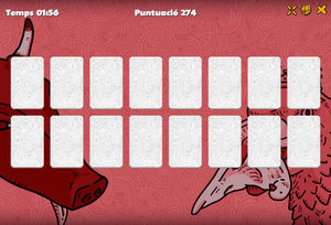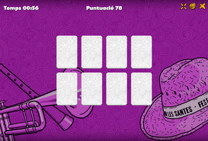 Diverteix-te trobant les parelles amagades! Clica sobre dues cartes i memoritza la comparsa o l’element de Les Santes que aparegui, i la seva ubicació. Les cartes es taparan automàticament i tindràs una nova oportunitat per destapar-ne dues, amb la finalitat d’aconseguir la parella de cartes iguals. Cada partida té una mica més de dificultat. Intenta fer-ho en el menor temps possible!